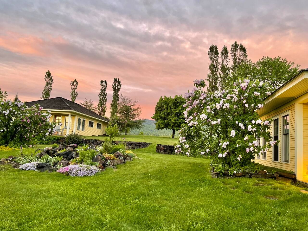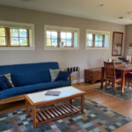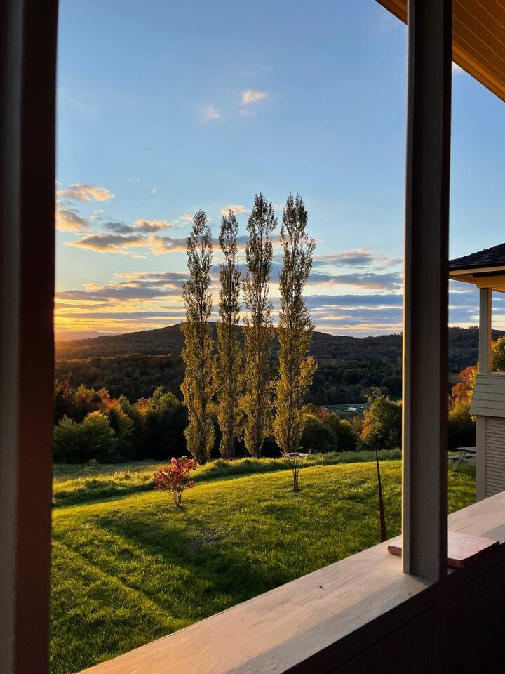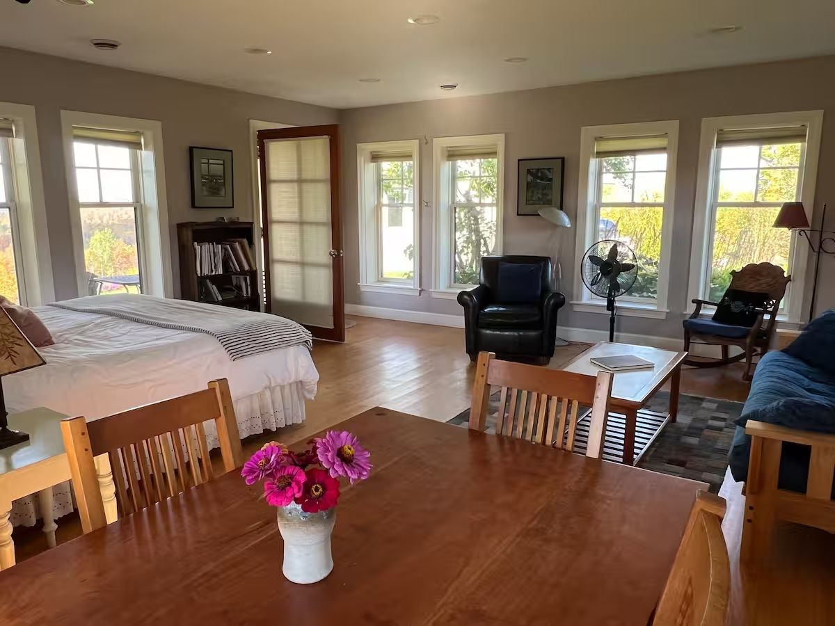 The Kirby Compound was designed and built by artists, so it’s no surprise that you’ll see beautiful landscapes in every direction. There are three rental units available in this very private, yet nearby location (4 miles to Lyndonville, 5 miles to East Burke). This compound is perfect for large groups (biking friends, family reunions, etc.), set on a totally private property, with gardens, an orchard, and 40 acres of trails to explore. 2 of the units (the cottage and the apt.) are pet friendly when approved, and there is an extra cost of $25 per day per pet.