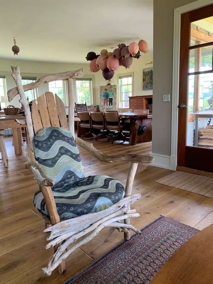 The Loft is where my husband and I live when we are not in LA. Although it is still a work in progress, it has the most incredible view of the property. It is cozy, with a wood stove, and has many large tables to work on.