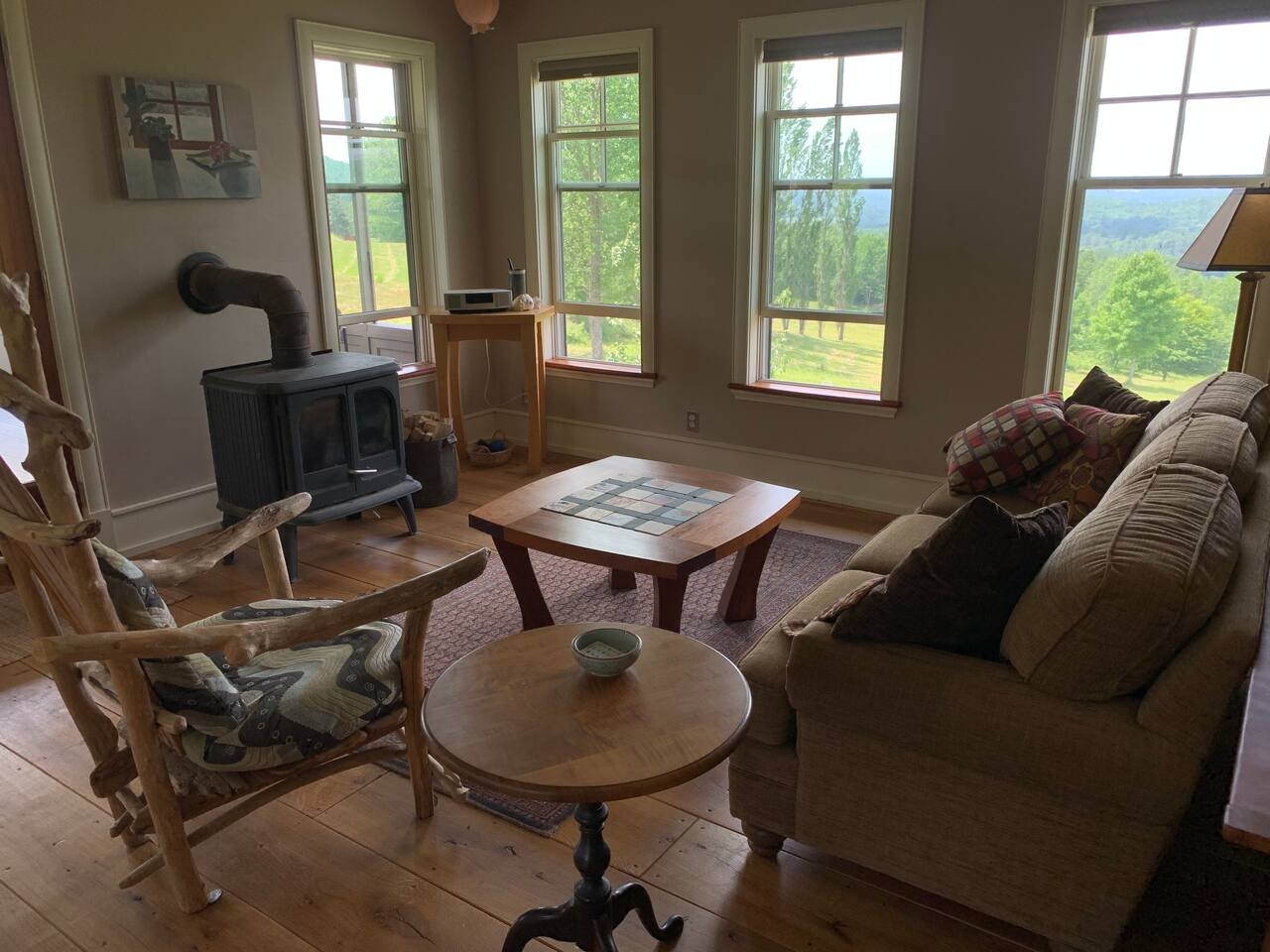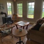 The Apartment is the first floor of our home, with it’s own private entrance, parking, firepit and incredible views. There is one bedroom with a queen bend and another huge bedroom with a queen bed (and couch) and room for several blow up beds. There is also a room with a full sized futon (and wood stove). The well equipped kitchen/living area is large, with a couple of couches. There are a washer and dryer in the large bathroom.